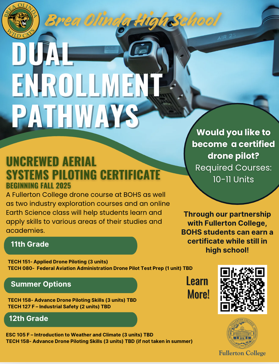 Students and families interested in the drone certificate program or other dual-enrollment opportunities can contact the Brea Olinda High School counseling office or visit the BOHS Dual Enrollment website.