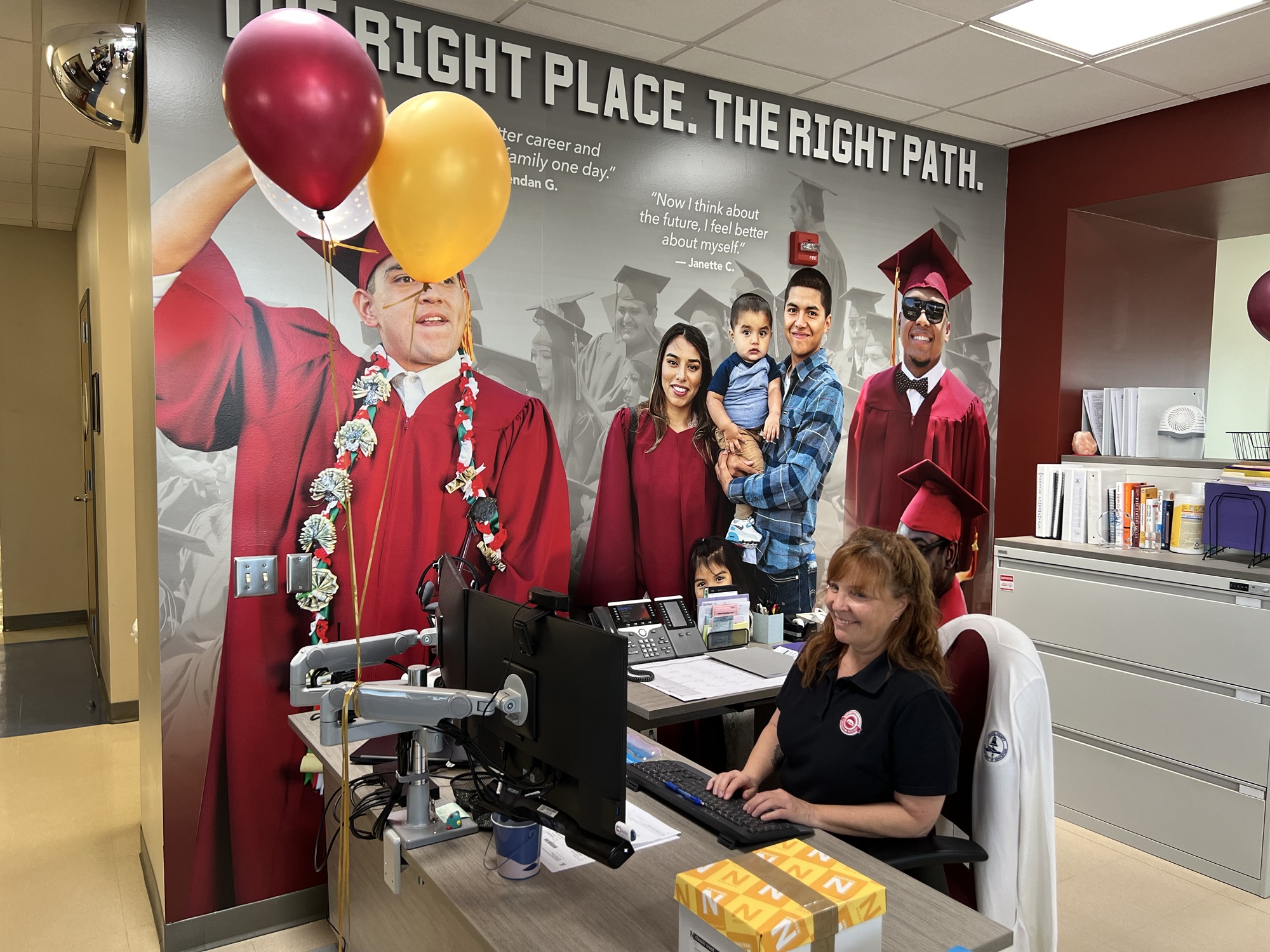 The walls of the new CCPA headquarters are similarly adorned with large graphics of students in maroon graduation attire, accompanied by real quotes from students, such as “Now I think about the future, I feel better about myself” and “It doesn’t matter how long it took, as long as we did it!”