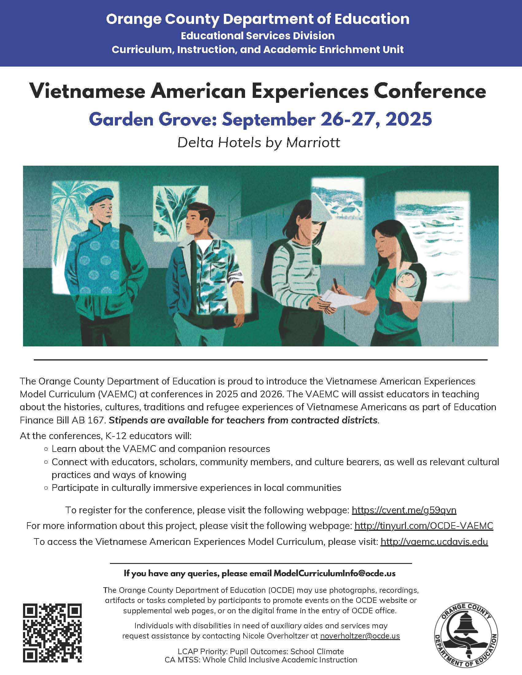 Quick look: OCDE will host the Vietnamese American Experiences Model Curriculum Conference on Sept. 26-27 in Garden Grove. K-12 educators can explore new curriculum resources, attend guest presentations and join sessions on Vietnamese American history and culture.