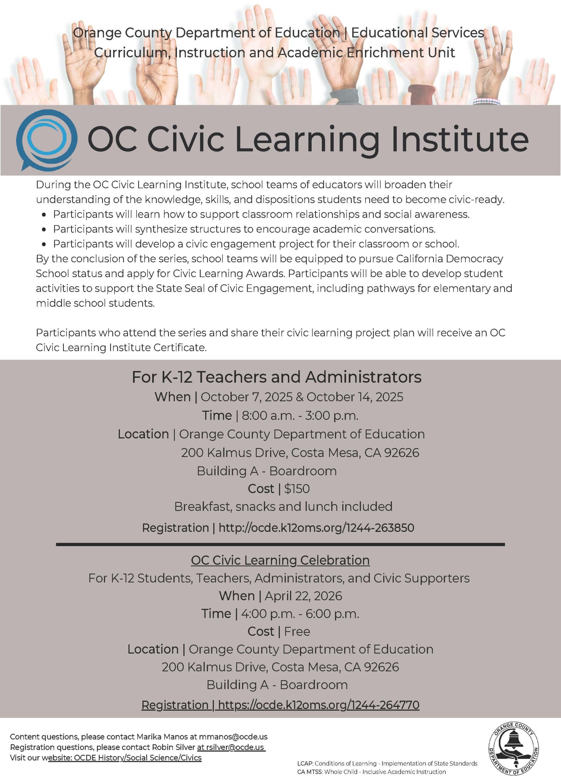 To register for the 2025 OC Civic Learning Institute, visit ocde.k12oms.org/1244-263850. For questions about the program, contact Dr. Marika Manos at mmanos@ocde.us. For help with registration, contact Robin Silver at rsilver@ocde.us.