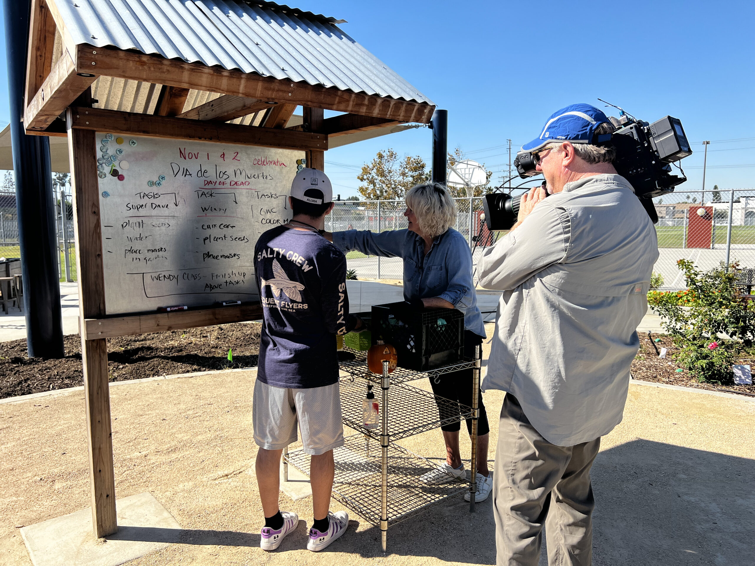 Career technical education teacher Marianne Taylor discusses garden tasks with a student at the Harbor Learning Center South campus in Fountain Valley while being filmed by KCAL News for a segment in November 2023.