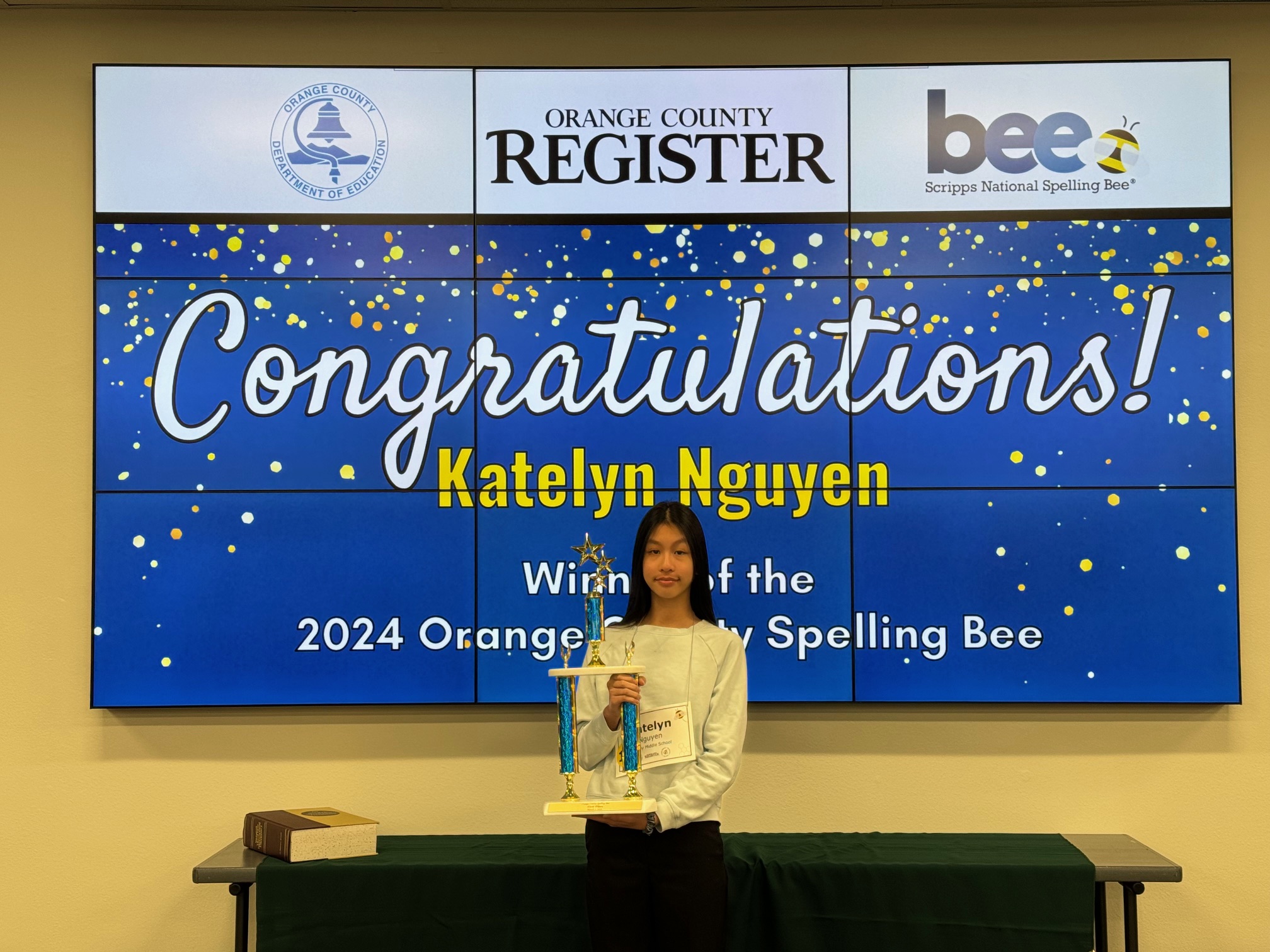 Katelyn Nguyen, a seventh-grader from Stacey Middle School in the Westminster School District, emerged victorious in the 20th round of the Orange County Spelling Bee by correctly sequencing the letters in “discretionary,” meaning subject to individual judgment. With the win comes a trip to the famed Scripps National Spelling Bee in May, with travel expenses covered by the Orange County Register.