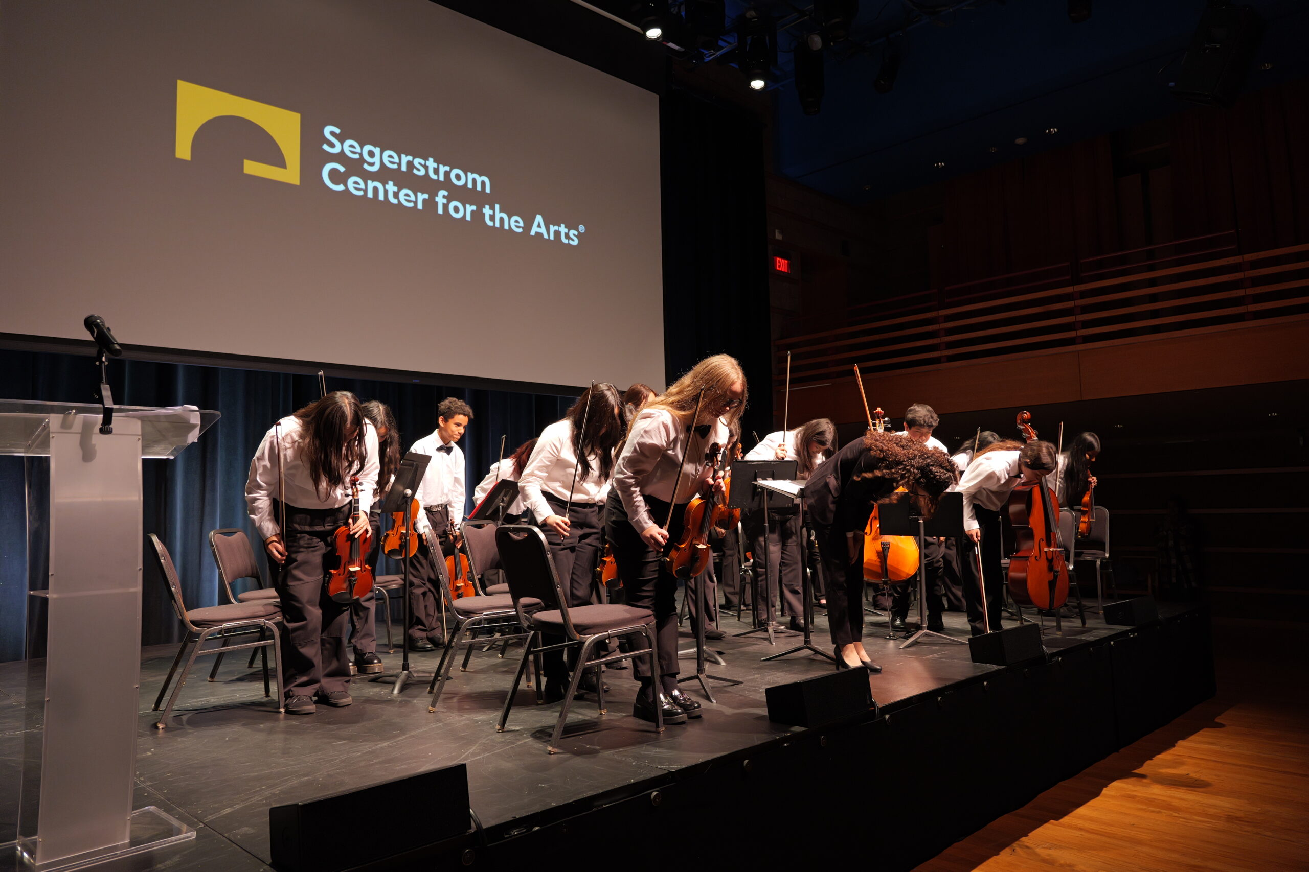 • Jennifer Garcia, a music teacher from the Placentia-Yorba Linda Unified School District, and her advanced orchestra students take a bow after their performance at the 2025 Orange County Music and Arts Administrators Awards ceremony.