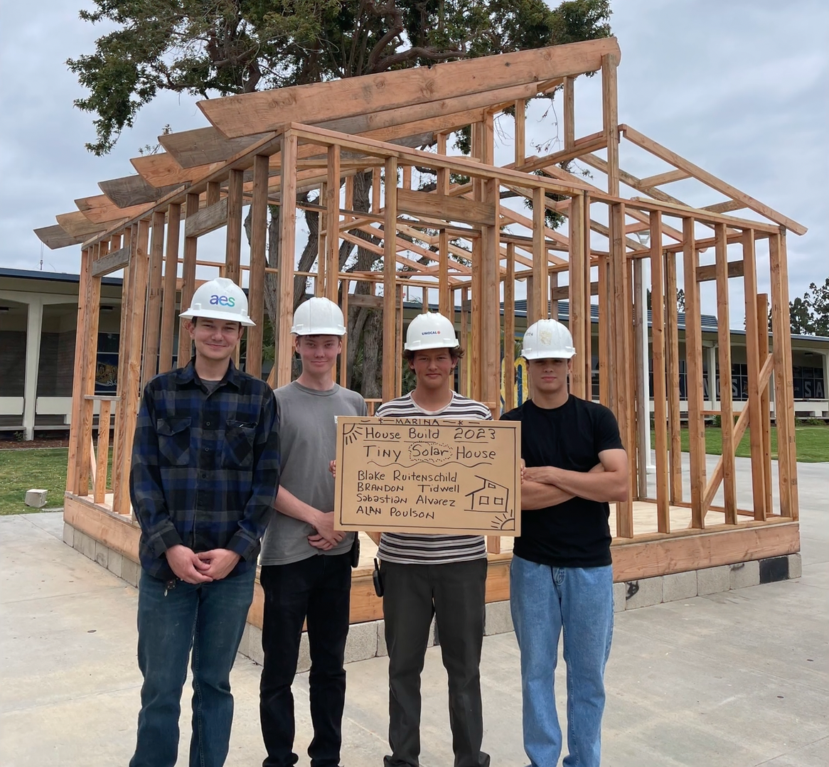 In the middle of Marina High School, a wooden framework of a tiny house sits as a potential solution for a more energy-efficient future.
