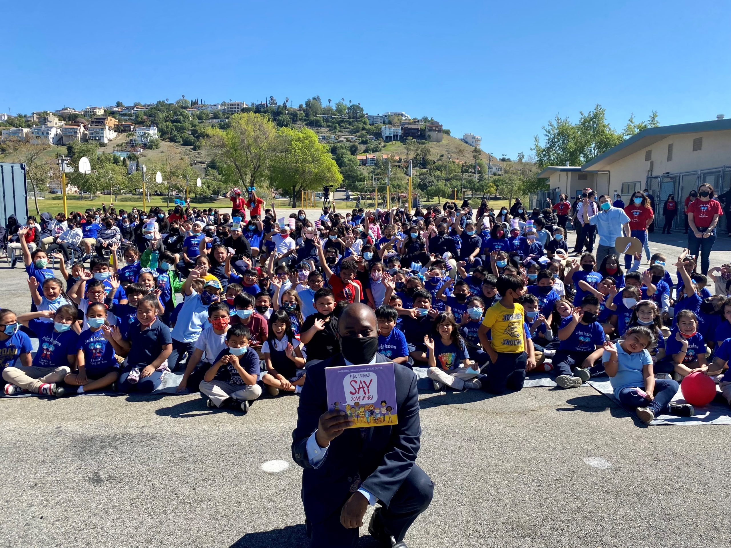 In honor of Read Across America Day, State Superintendent of Public Instruction Tony Thurmond paid a visit to the Jordan Academy of Language and Computer Science in Orange, volunteering as a guest reader during an outdoor assembly.