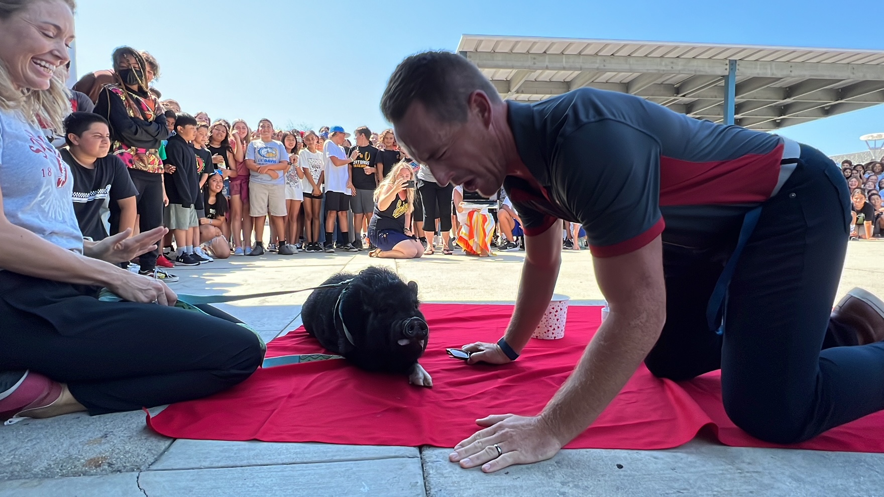 With staff and the children as his witnesses, Dr. Weiss-Wright from the Los Alamitos Unified School District kissed a 65-pound pig named “Piglet” on its snout. The event was livestreamed to classrooms.